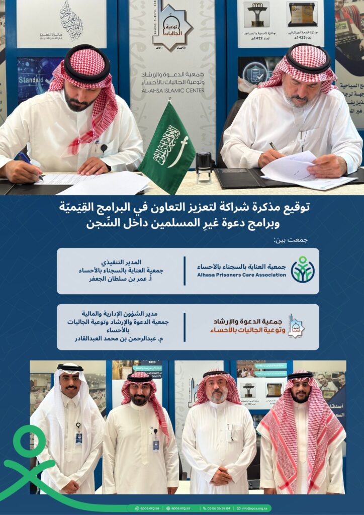 يسعدنا توقيع مذكرة شراكة مع جمعية الدعوة والإرشاد وتوعية الجاليات بالأحساء @ahsaic لتعزيز التعاون في البرامج القيمية وبرامج دعوة غير المسلمين للإسلام داخل السجن العام، سائلين الله أن يجعل هذا العمل مباركًا ونافِعًا، وأن يحقق أثرًا إيجابيًا في نفوس المستفيدين.